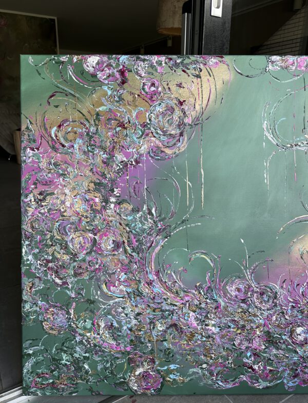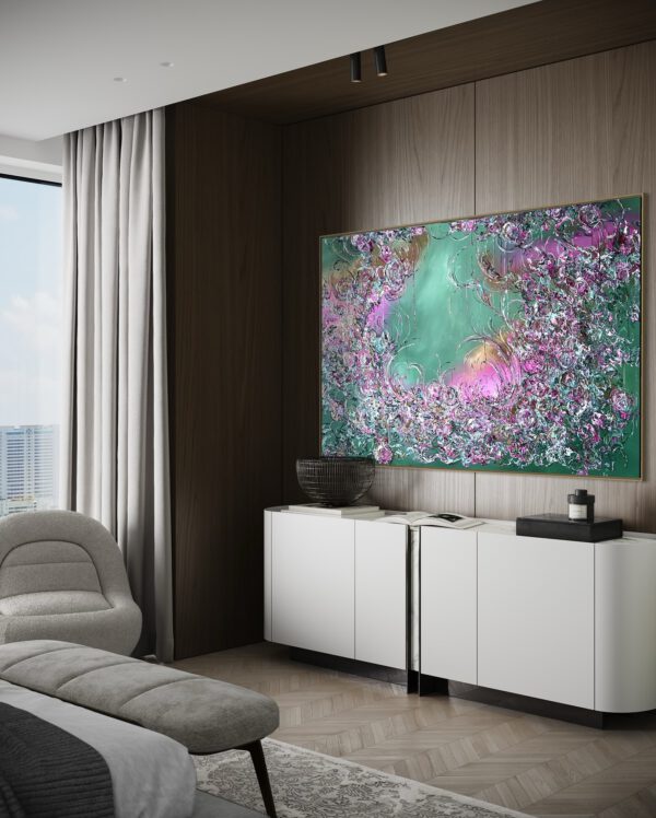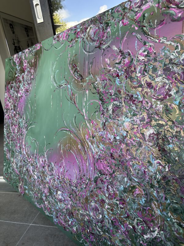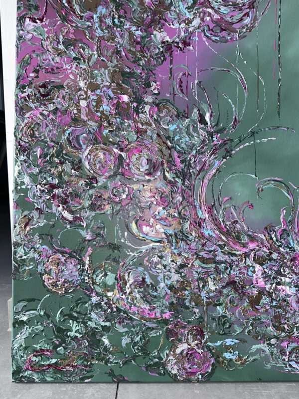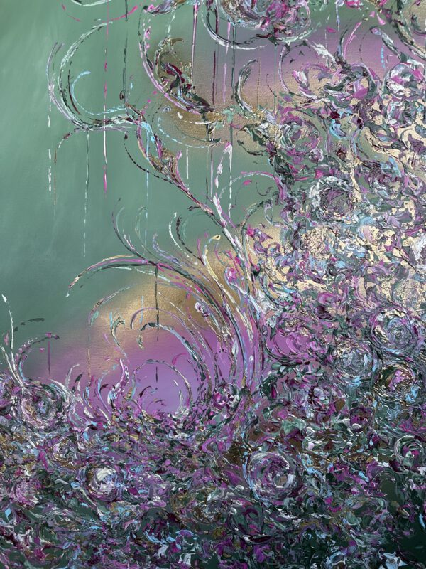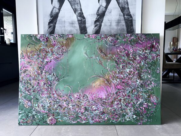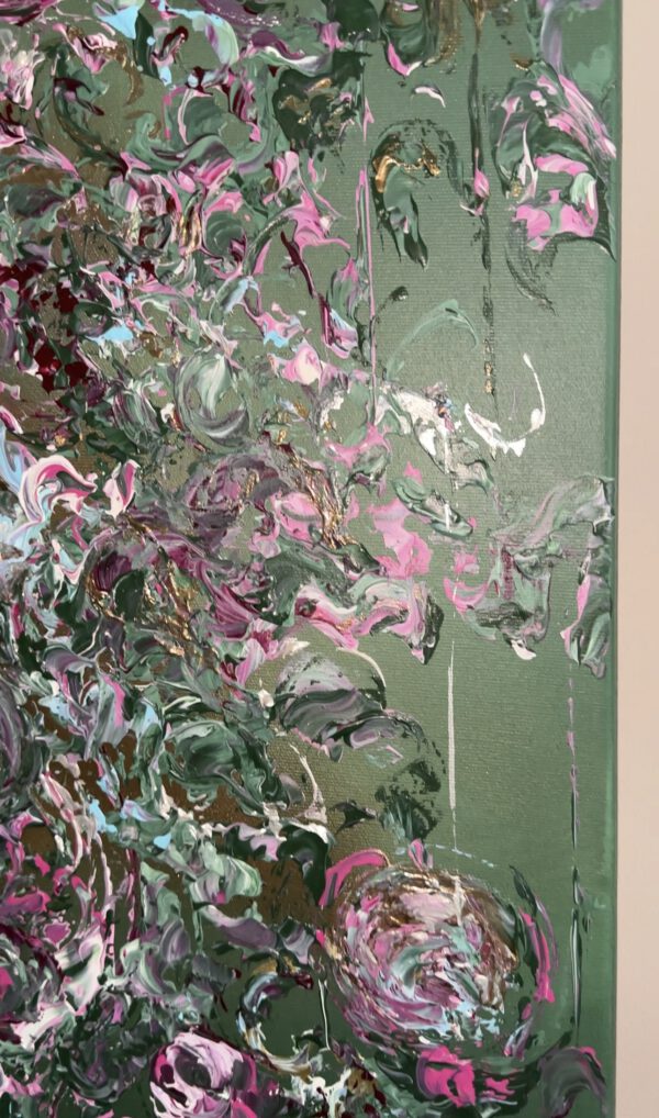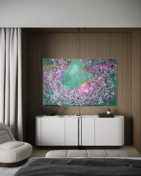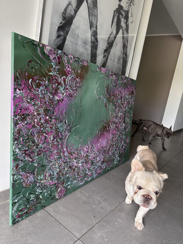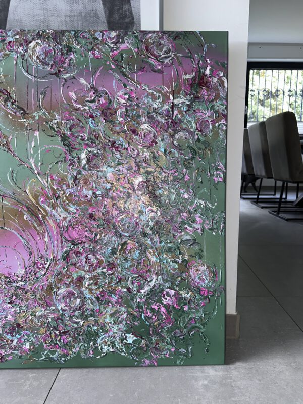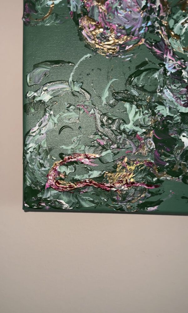 Die zarten, violett-rosanen Akzente setzen dazu einen lebendigen Kontrast. Sie leuchten wie kleine Aufbrüche des Gefühls, Sinnbilder für Zuneigung, Freude und die Leichtigkeit des Anfangs. Sie bringen Bewegung in die Tiefe des Grüns und lassen es in einem neuen Licht erscheinen.