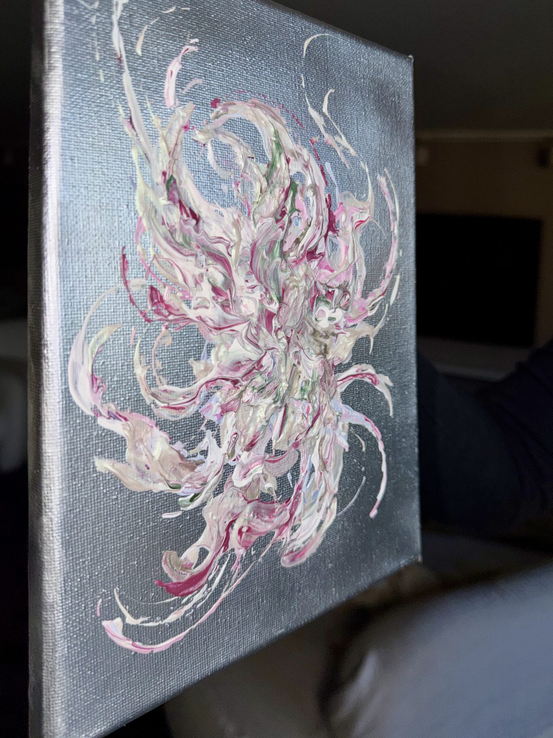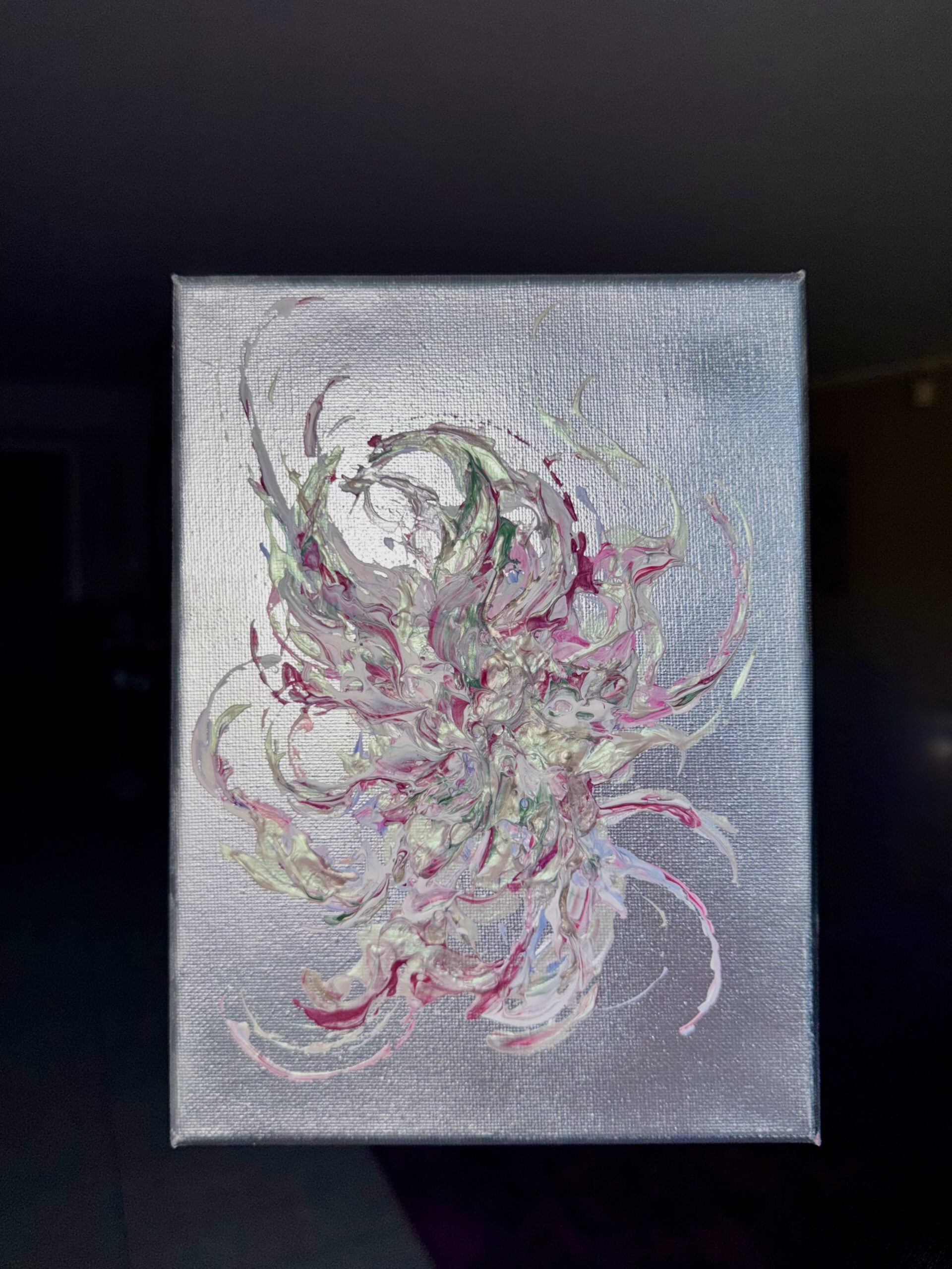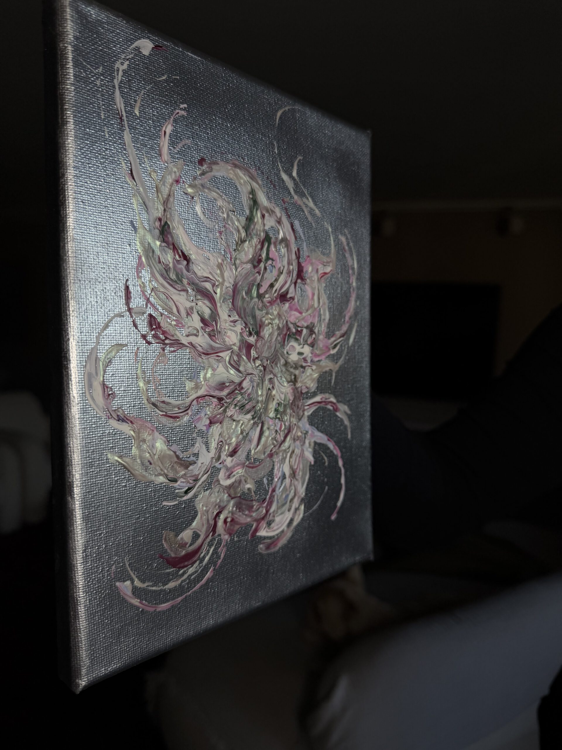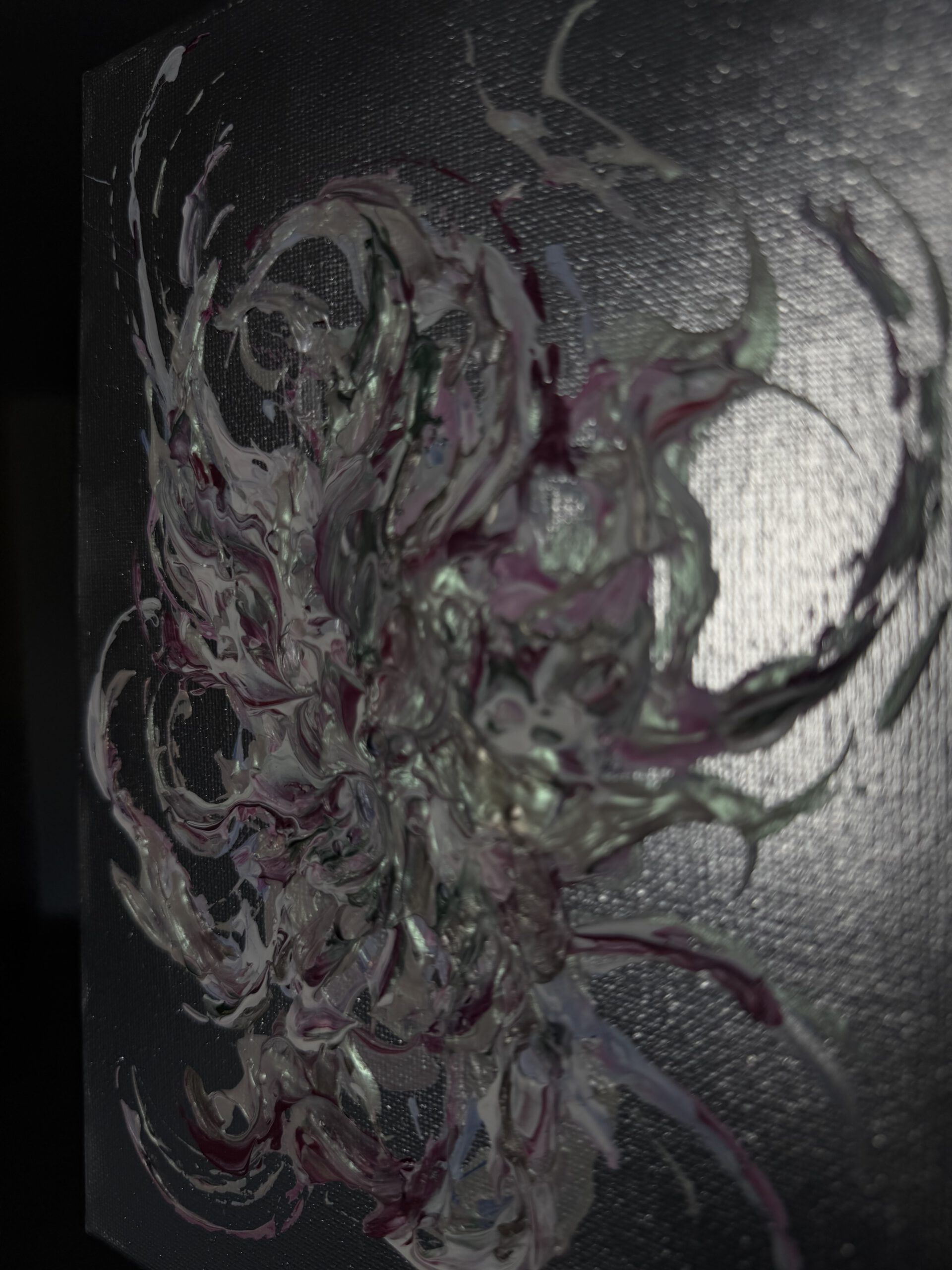 Chrome Heart ist eine leuchtende, chromartig gehaltene Komposition, die an ein pulsierendes Herz erinnert. Ausgehend von einem kraftvollen Zentrum verlaufen feine, venenartige Strukturen bis zum Rand des Bildes, wo sie sich zunehmend verdichten und subtil auslaufen. Die Formensprache vermittelt Bewegung, Energie und Lebendigkeit.