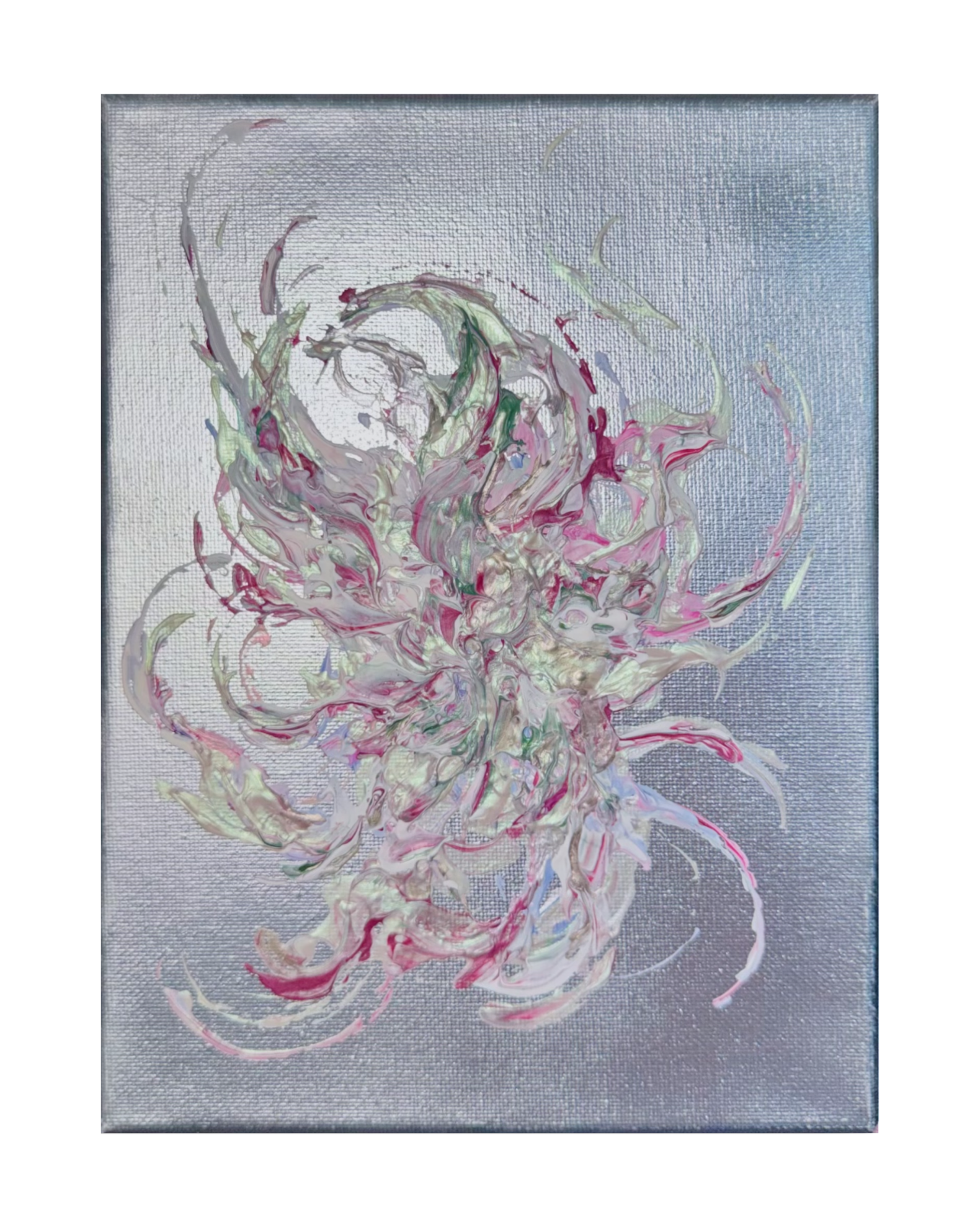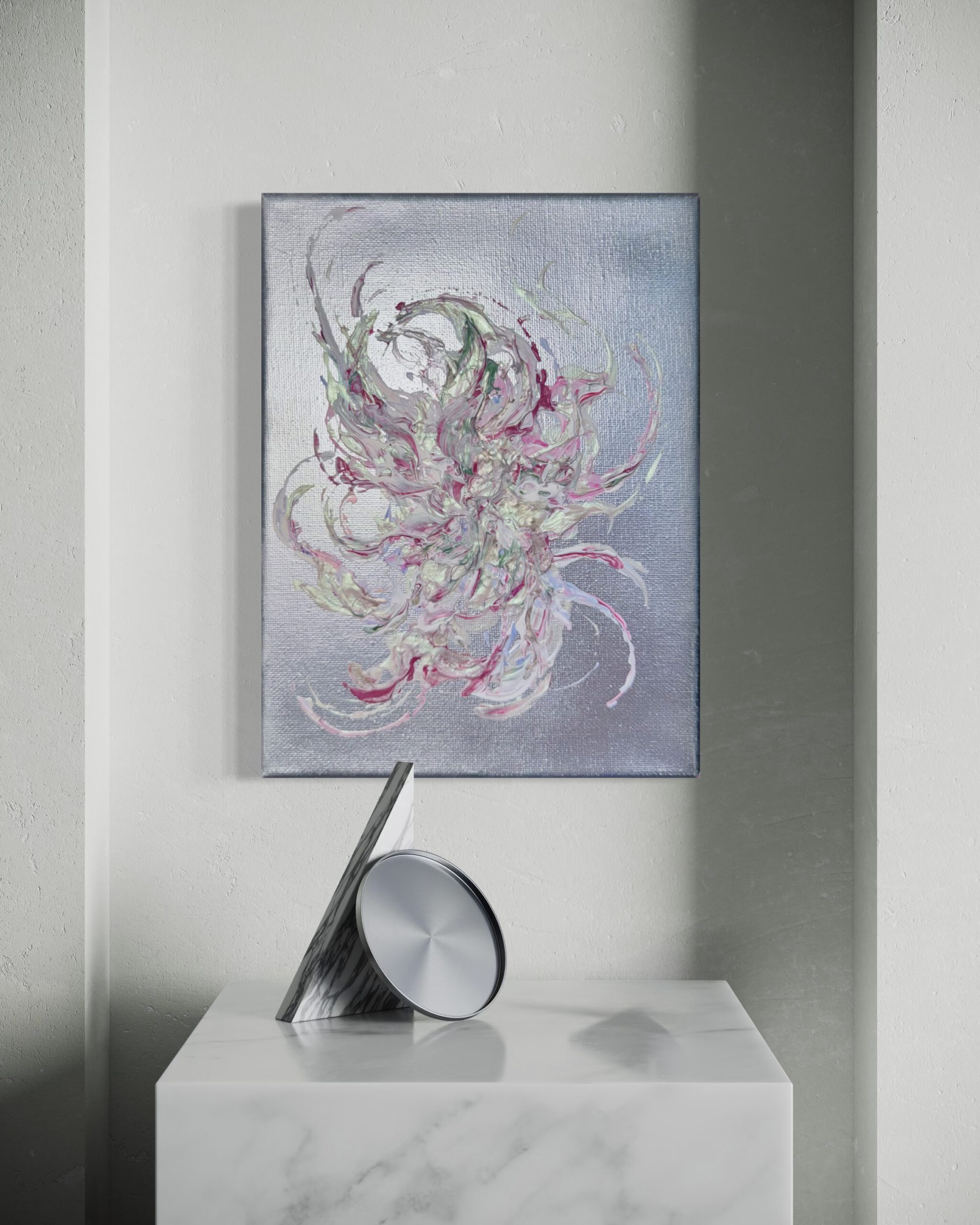 Die überwiegend hell gehaltene Farbwelt wird von zahlreichen Perlmuttakzenten durchzogen, die dem Werk eine schimmernde, fast metallische Tiefe verleihen. Die chromatische Anmutung verstärkt den Eindruck eines kühlen, zugleich lebendigen Herzens – technisch, modern und doch voller organischer Dynamik.