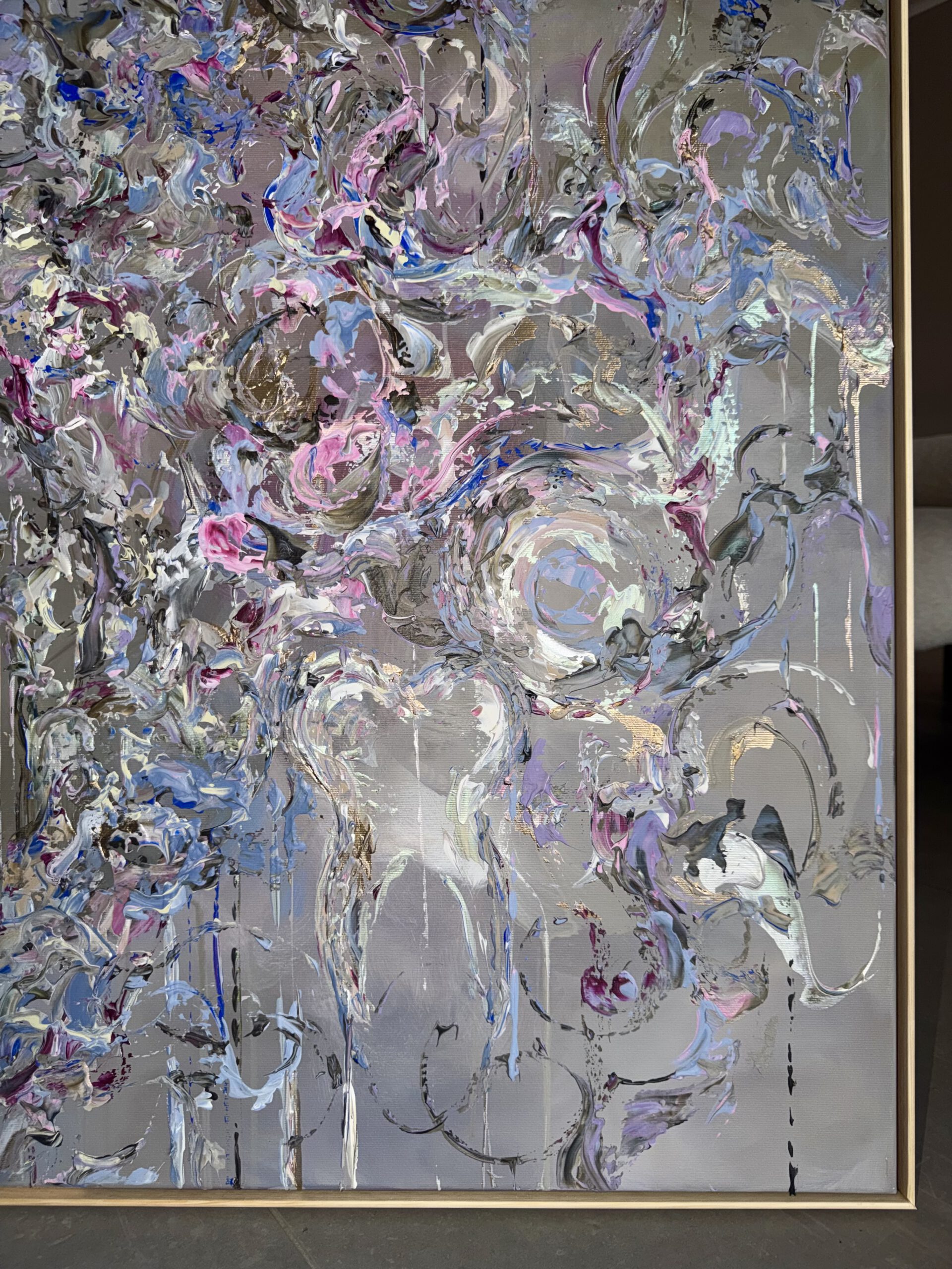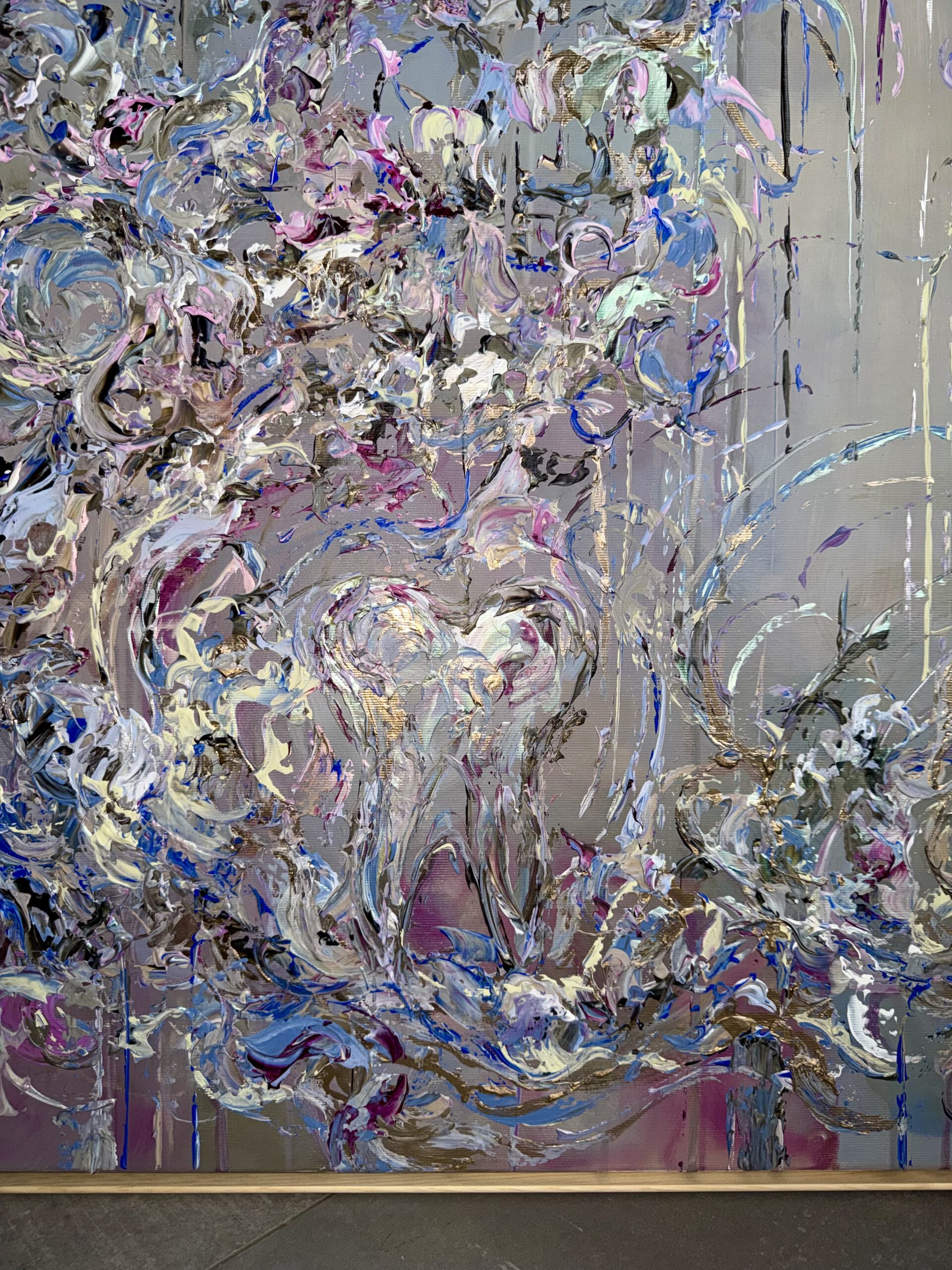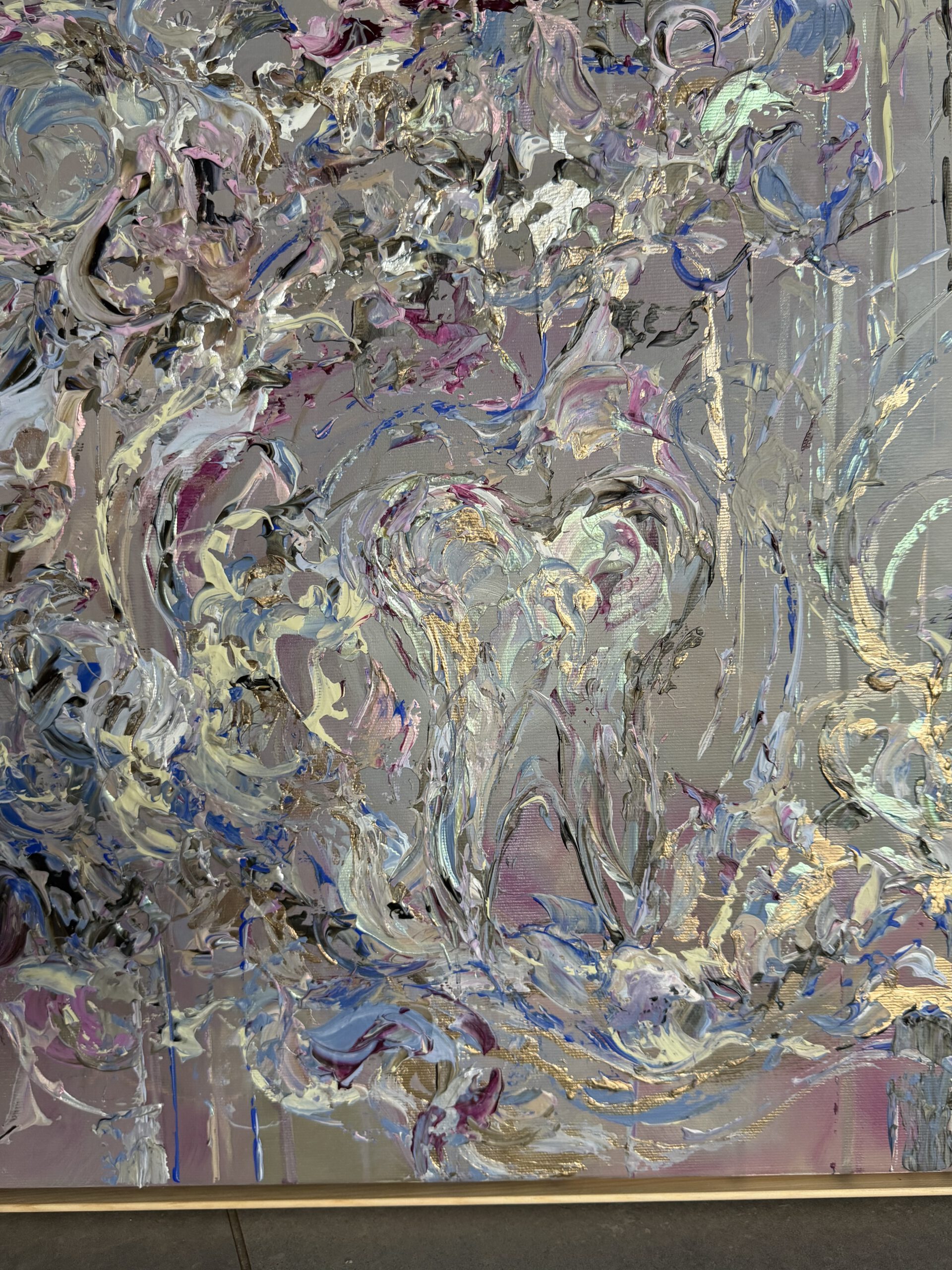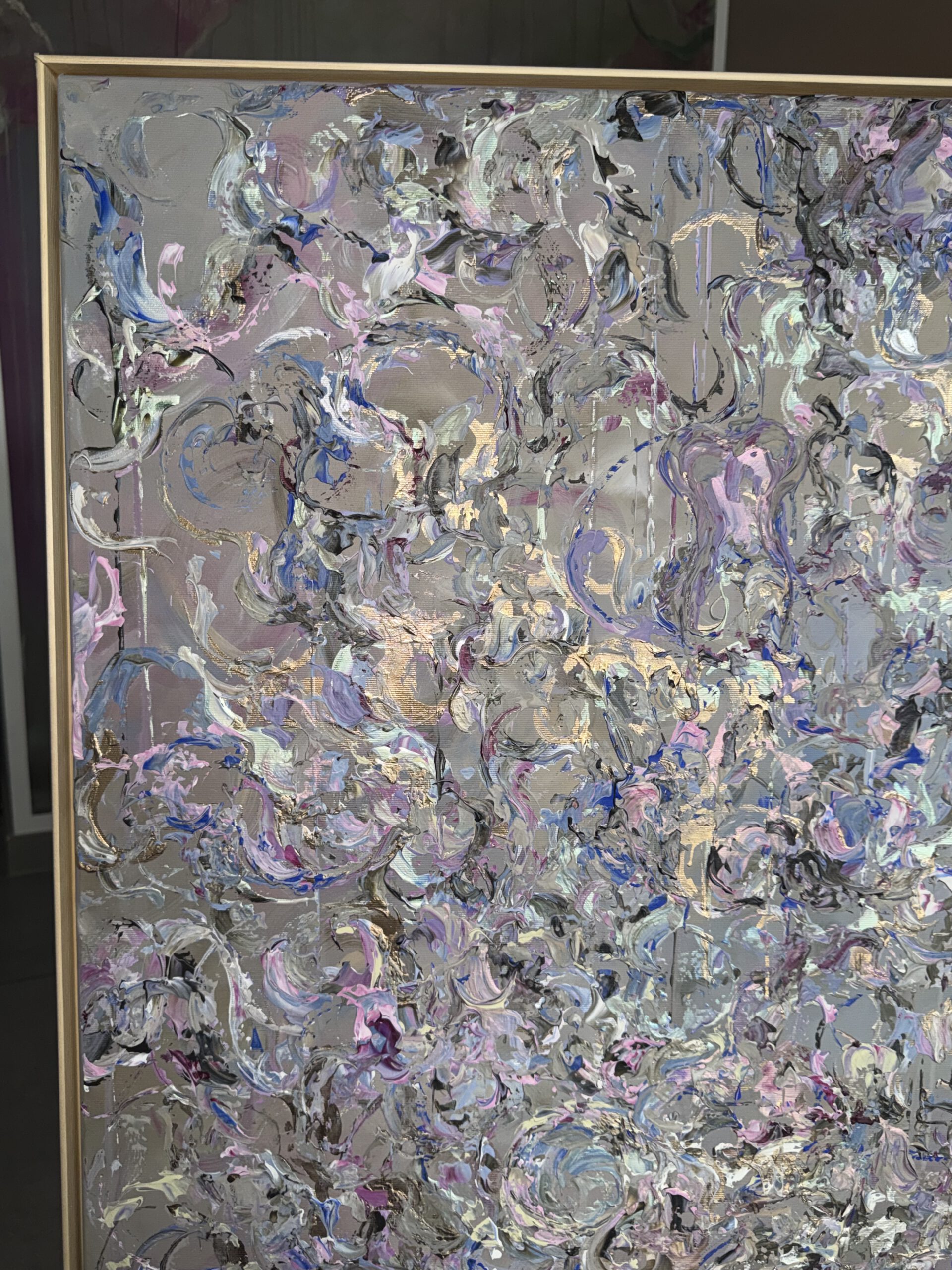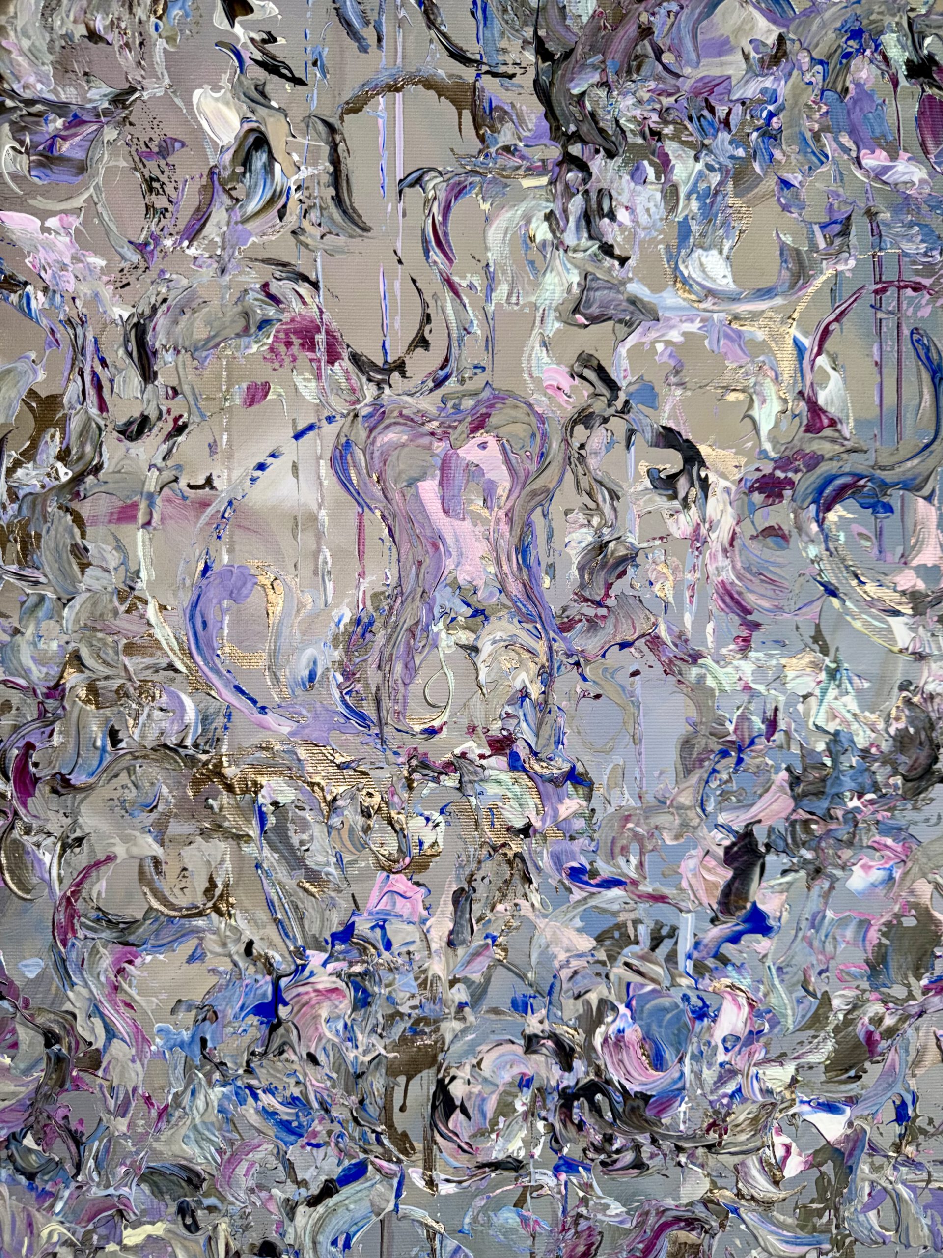 Im Vordergrund stehen metallische Farbräume aus tiefem Violett, intensivem Blau sowie warmen, dunklen Purpur- und Pflaumtönen. Diese werden von zarten Rosé- und Perlmuttakzenten begleitet, die je nach Lichteinfall in silbrigen, rosafarbenen und grünlichen Nuancen schimmern. Goldene Akzente setzen gezielte Lichtpunkte und verleihen dem Werk eine edle, nahezu kostbare Präsenz.