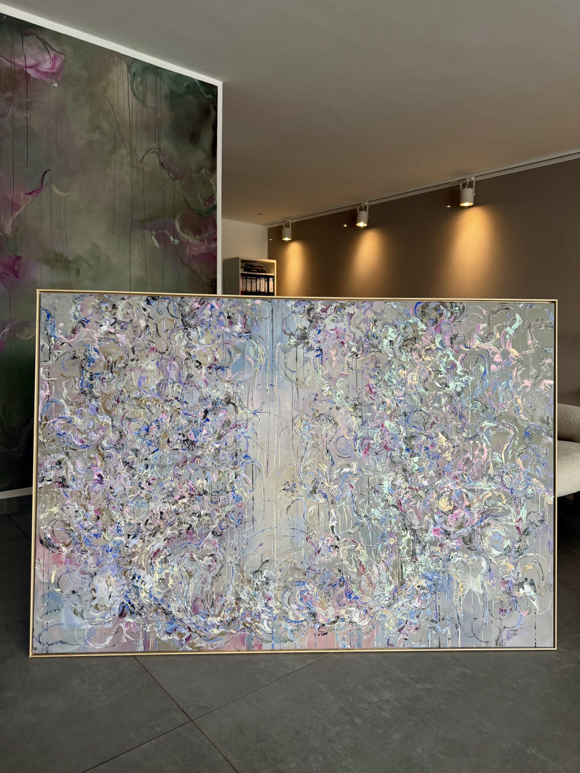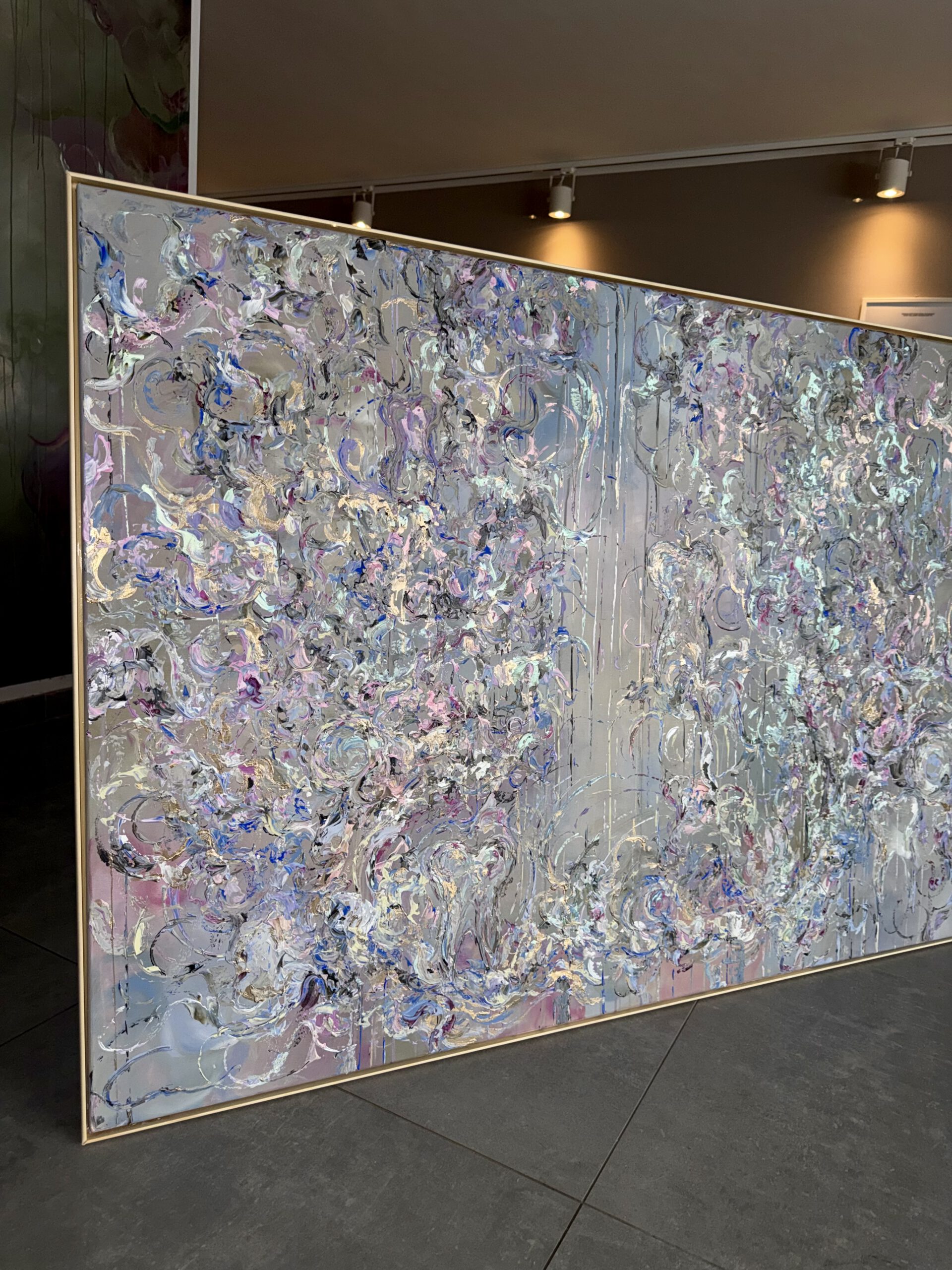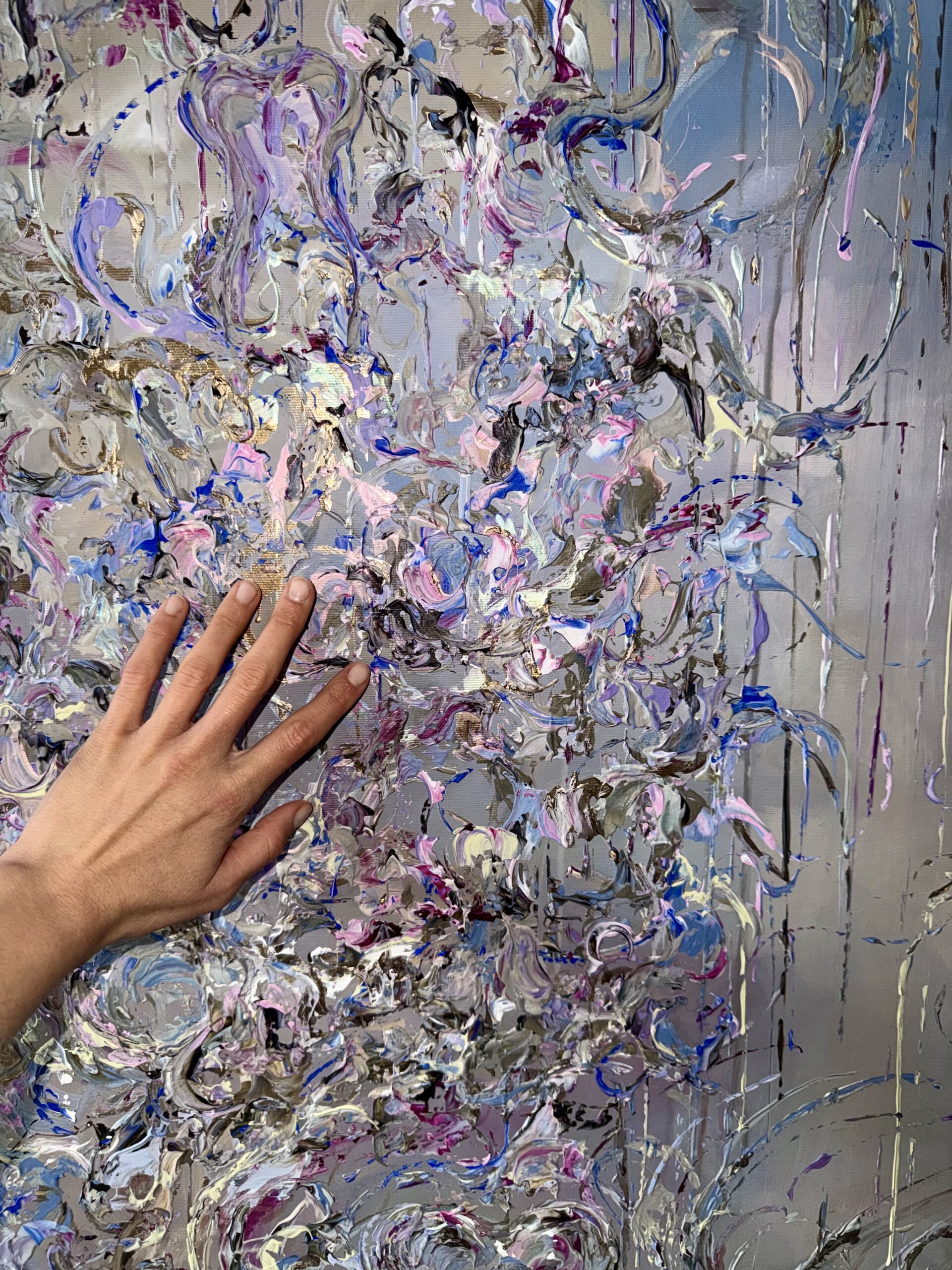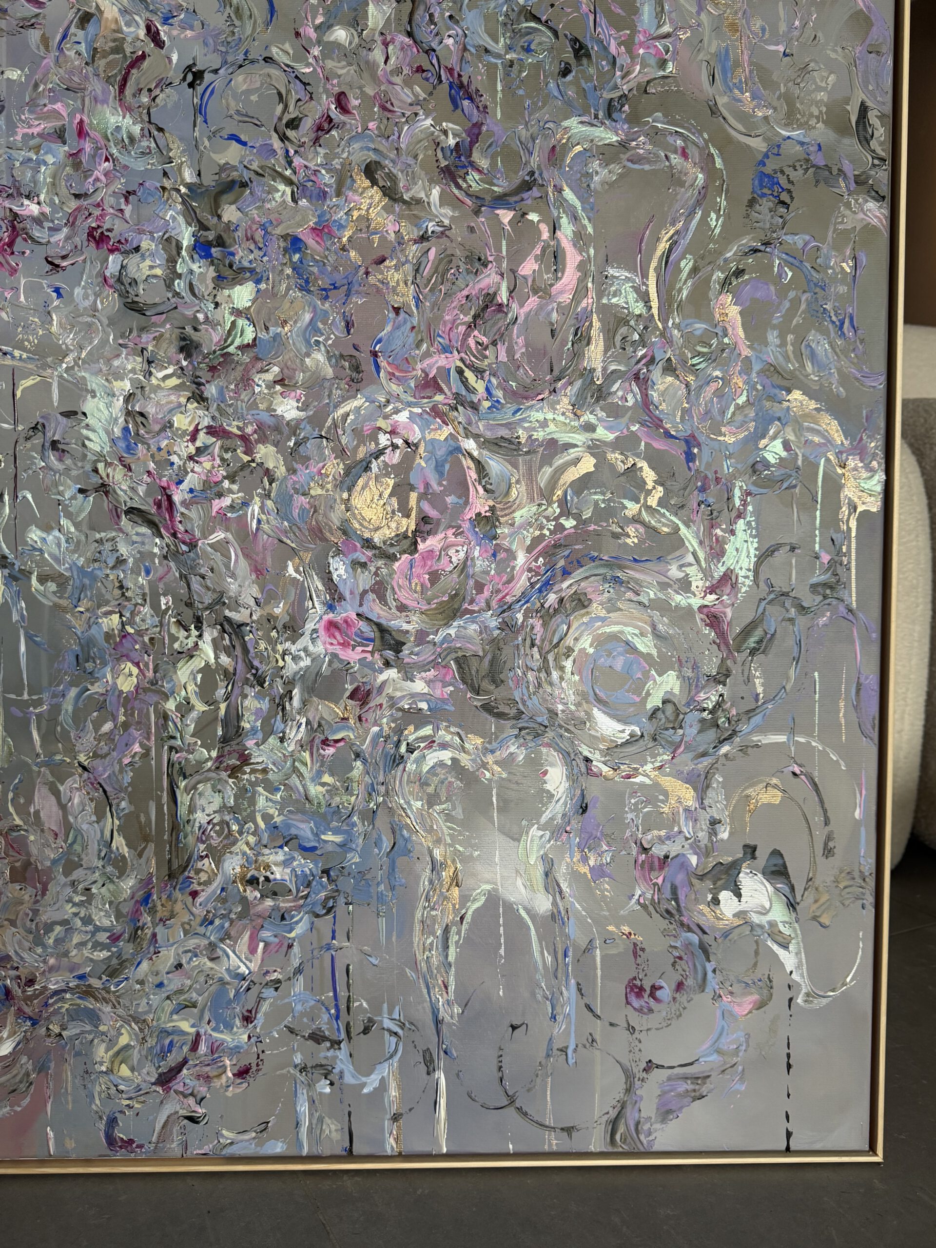 Im Vordergrund stehen metallische Farbräume aus tiefem Violett, intensivem Blau sowie warmen, dunklen Purpur- und Pflaumtönen. Diese werden von zarten Rosé- und Perlmuttakzenten begleitet, die je nach Lichteinfall in silbrigen, rosafarbenen und grünlichen Nuancen schimmern. Goldene Akzente setzen gezielte Lichtpunkte und verleihen dem Werk eine edle, nahezu kostbare Präsenz.
