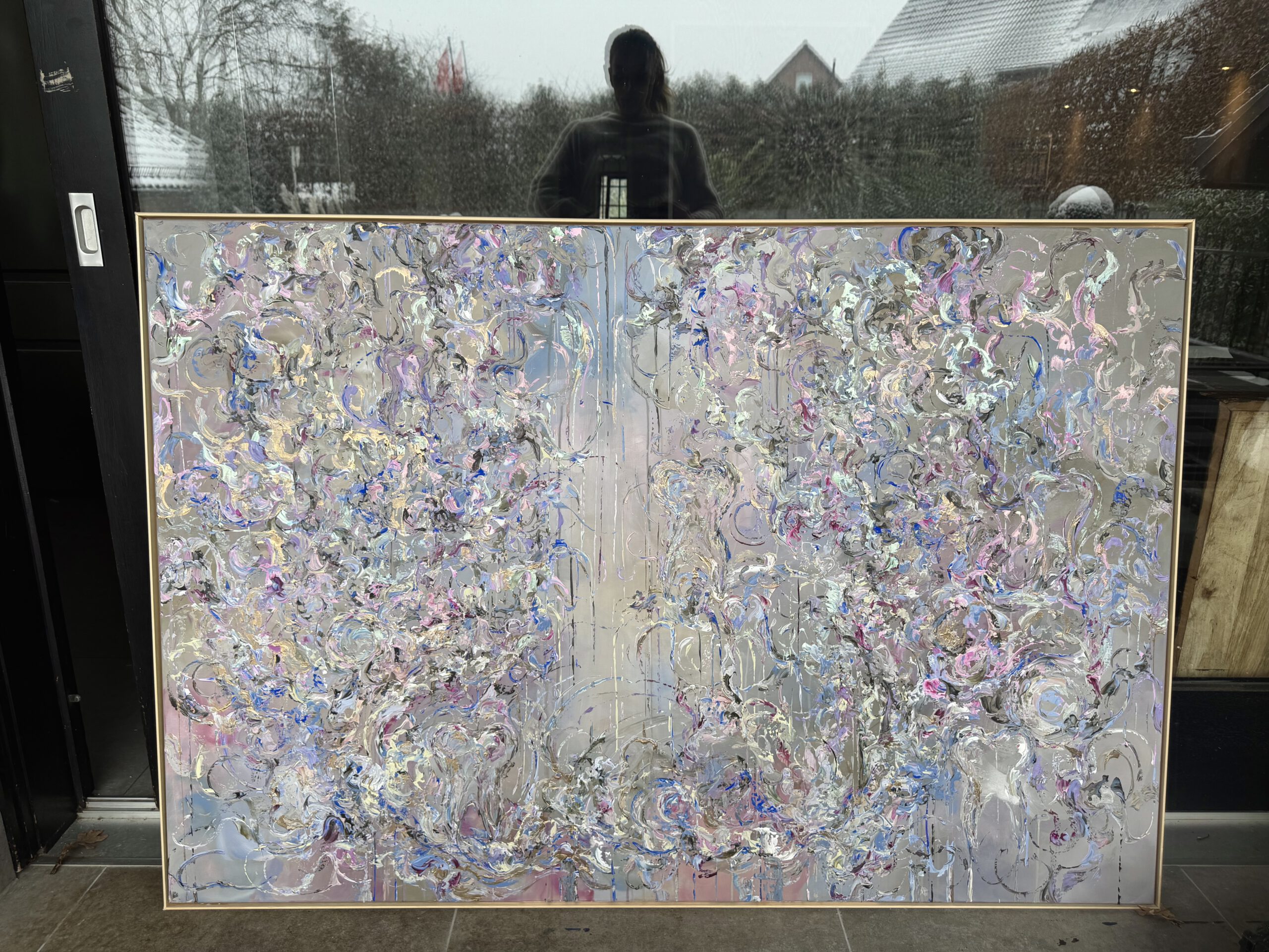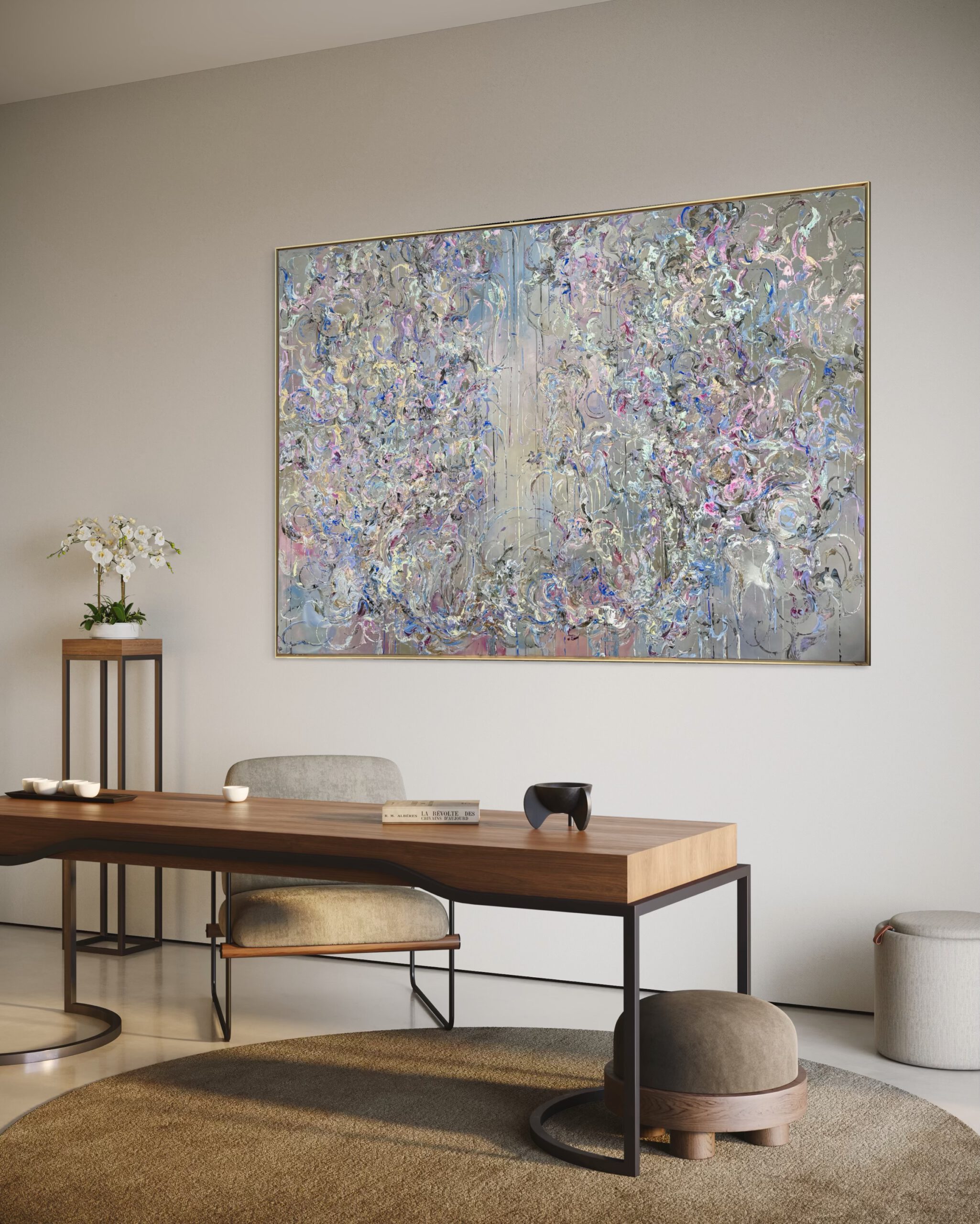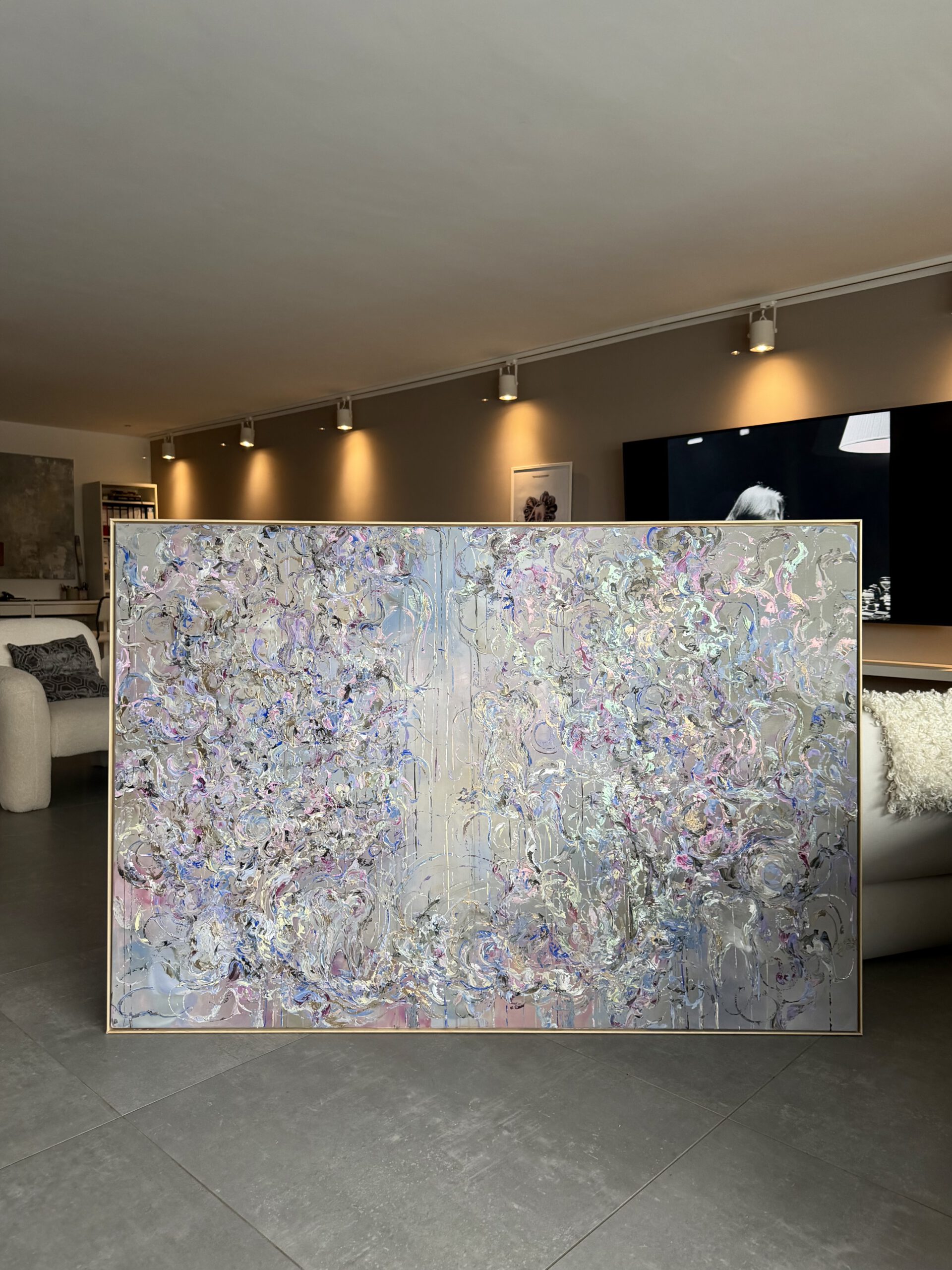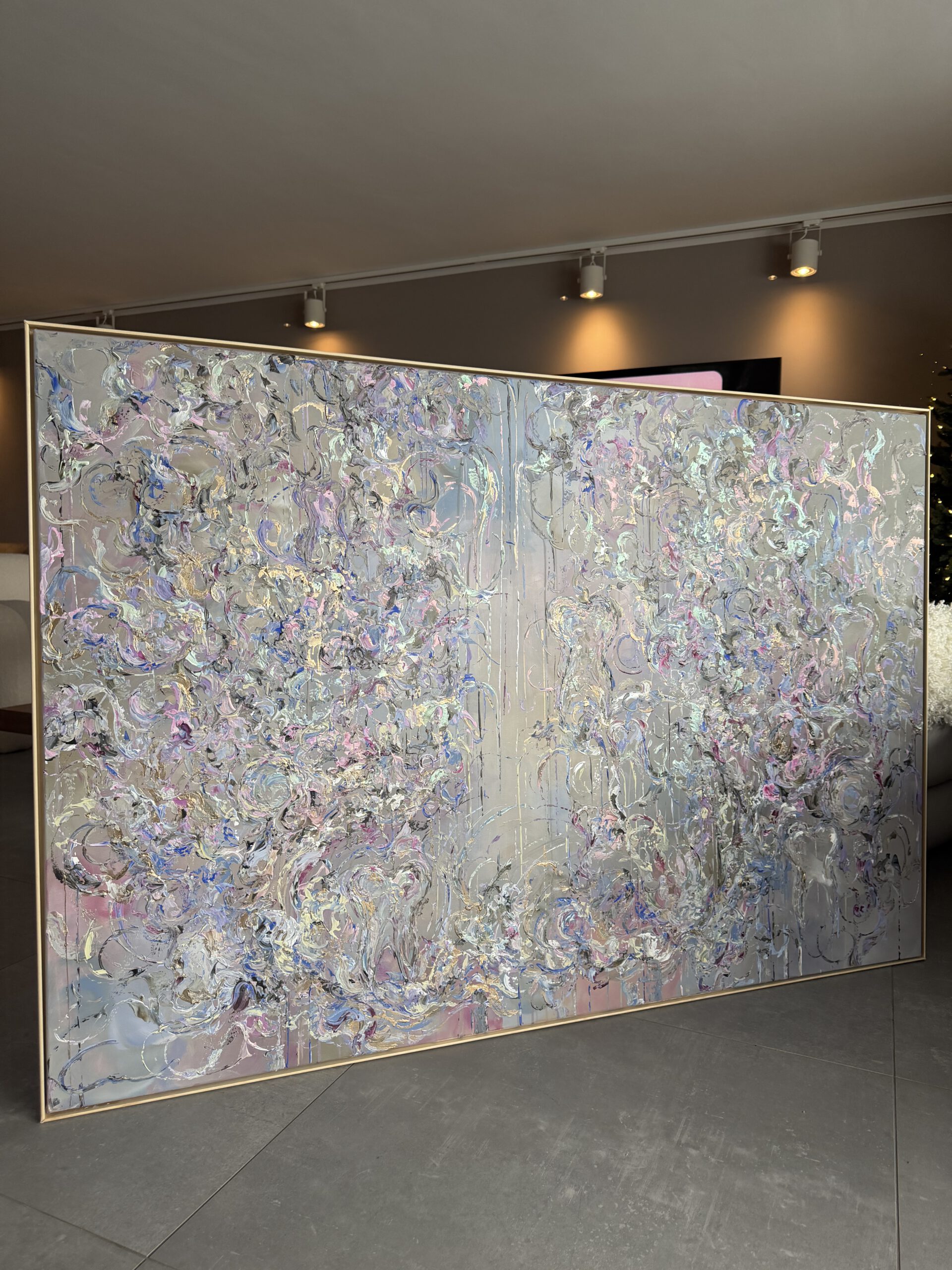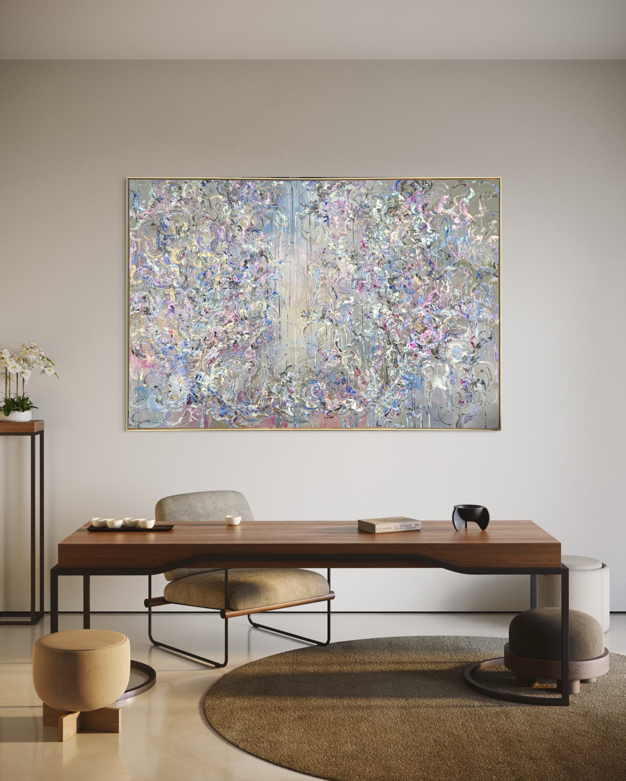 Im Vordergrund stehen metallische Farbräume aus tiefem Violett, intensivem Blau sowie warmen, dunklen Purpur- und Pflaumtönen. Diese werden von zarten Rosé- und Perlmuttakzenten begleitet, die je nach Lichteinfall in silbrigen, rosafarbenen und grünlichen Nuancen schimmern. Goldene Akzente setzen gezielte Lichtpunkte und verleihen dem Werk eine edle, nahezu kostbare Präsenz.