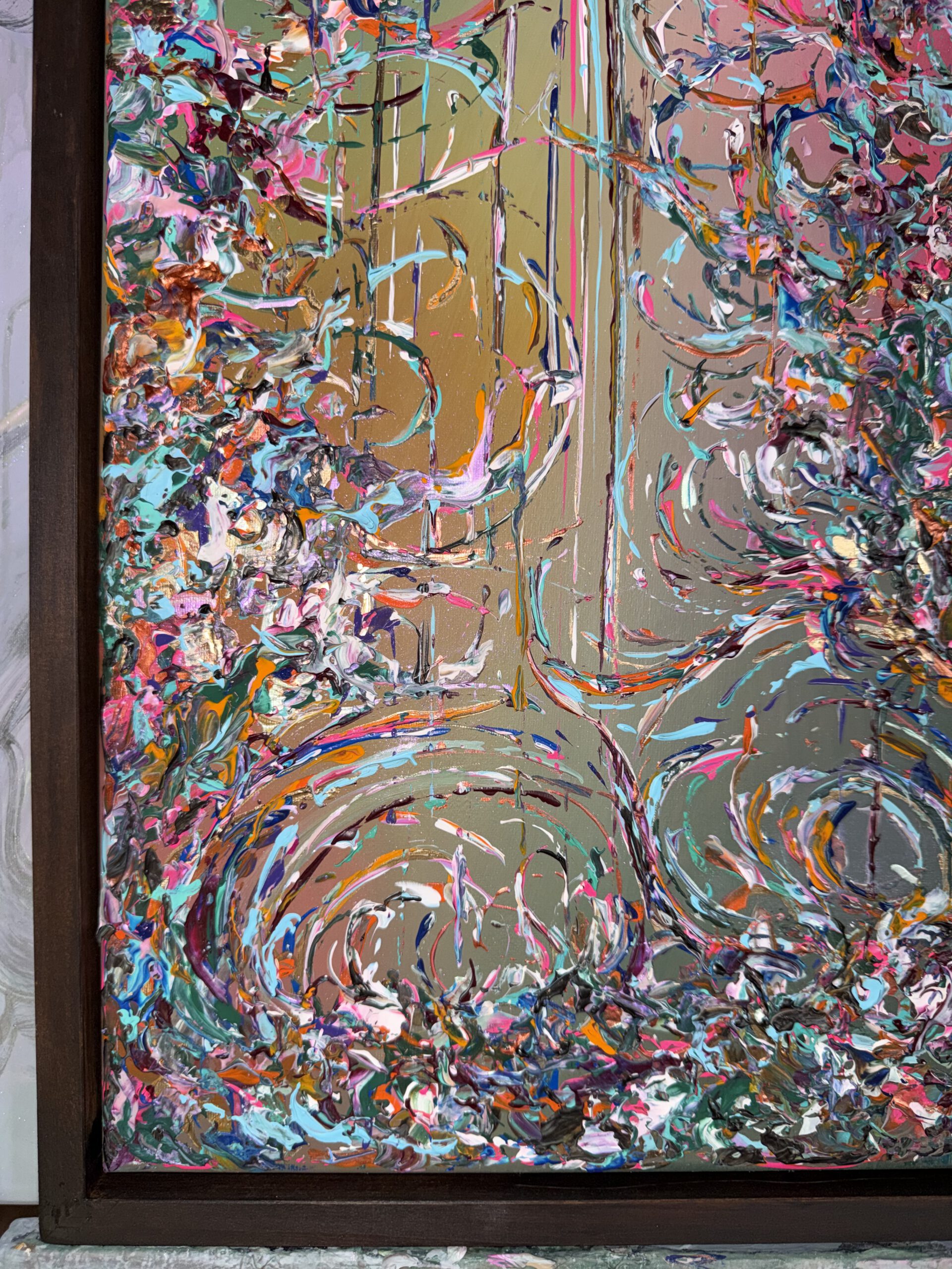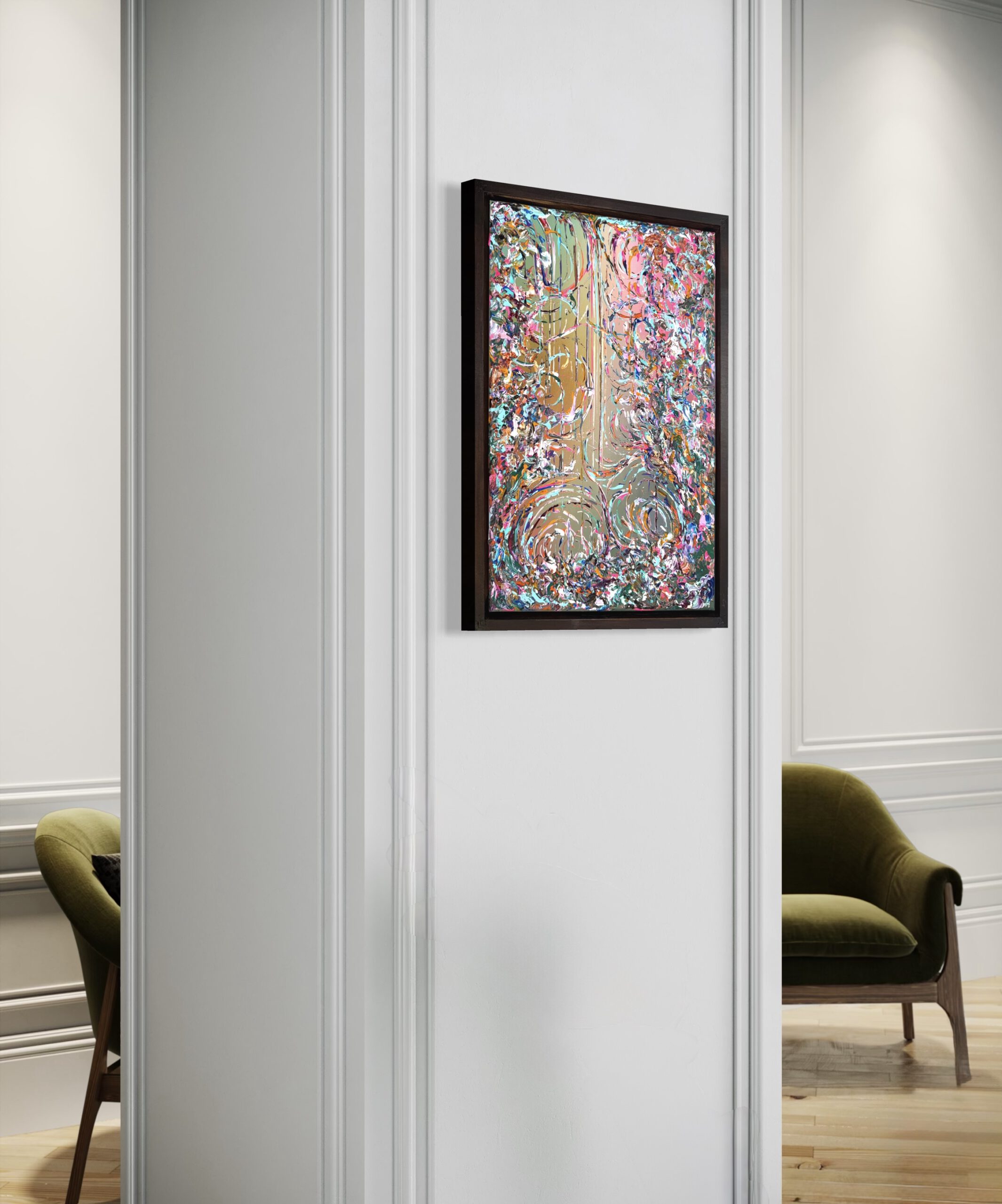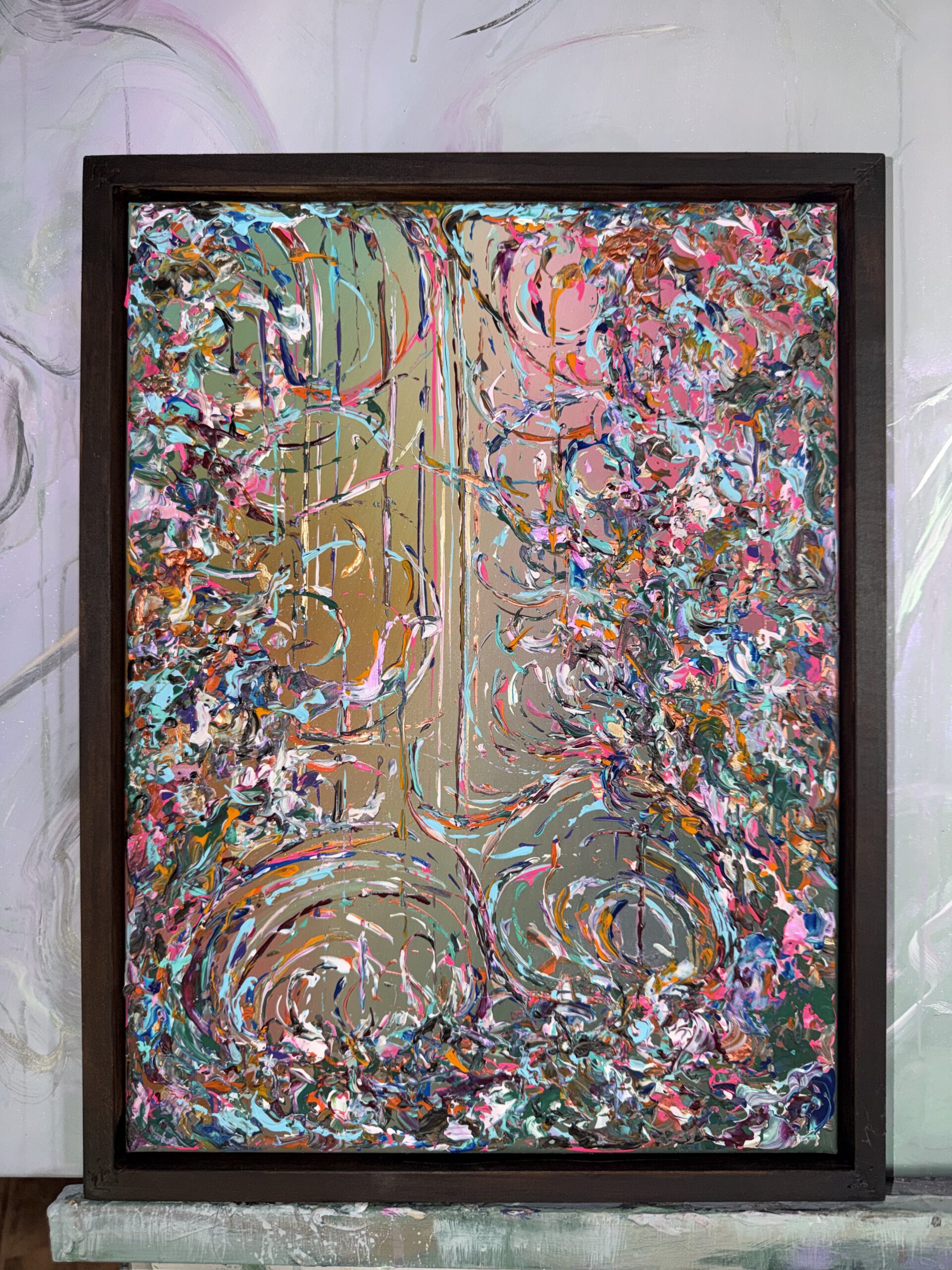 In diesem Werk verschmelzen Barockbögen zu einer fließenden, harmonischen Komposition. Prägnante Farben wie Orange, Pink, Blau und Türkis treffen auf zarte, perlmuttartige Nuancen und werden von Akzenten in Goldlack veredelt. „Ibiza“ fängt die Leuchtkraft und Lebendigkeit der Inselfarben ein und verbindet opulente Formen mit einem modernen, spielerischen Ausdruck.