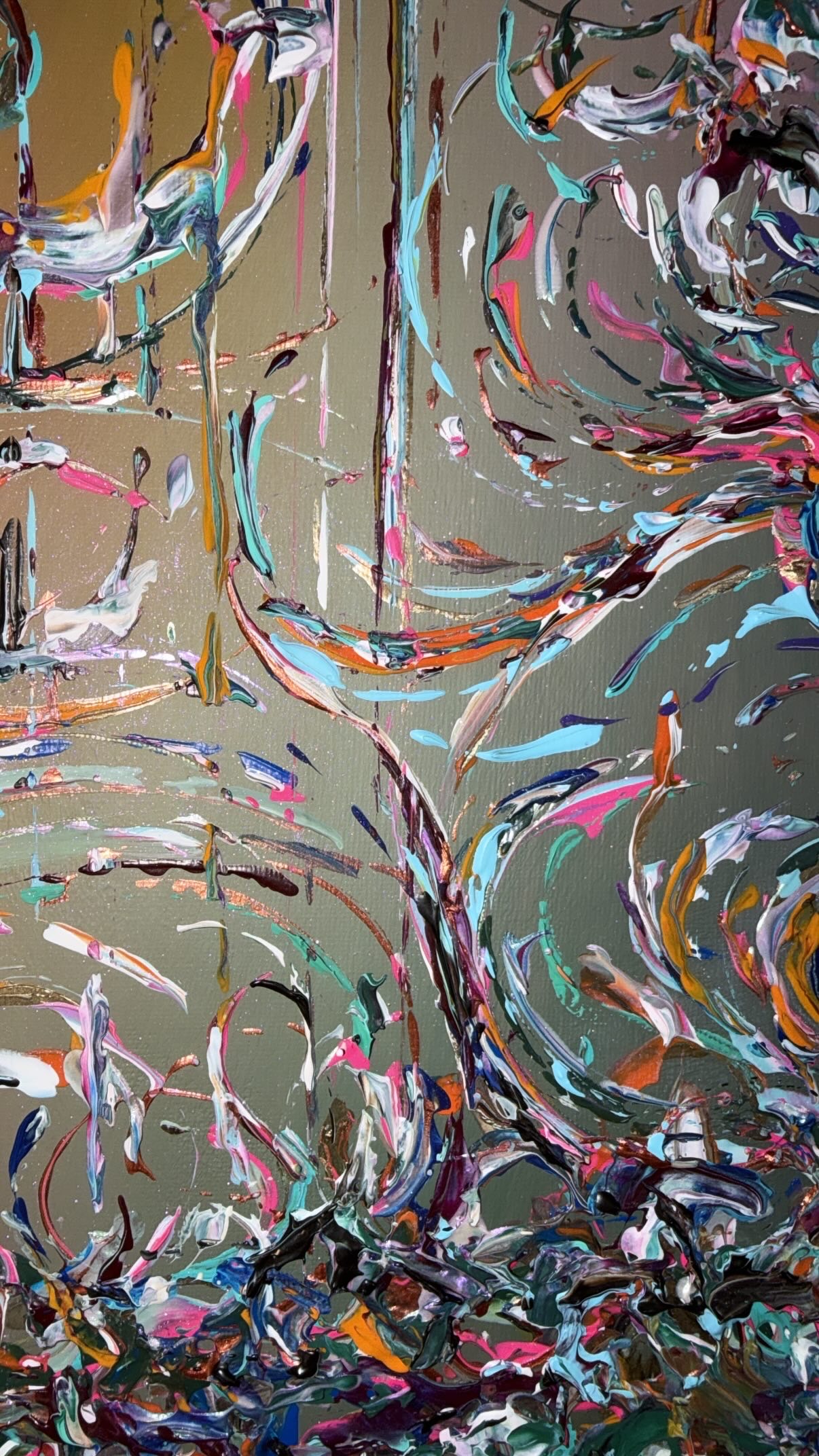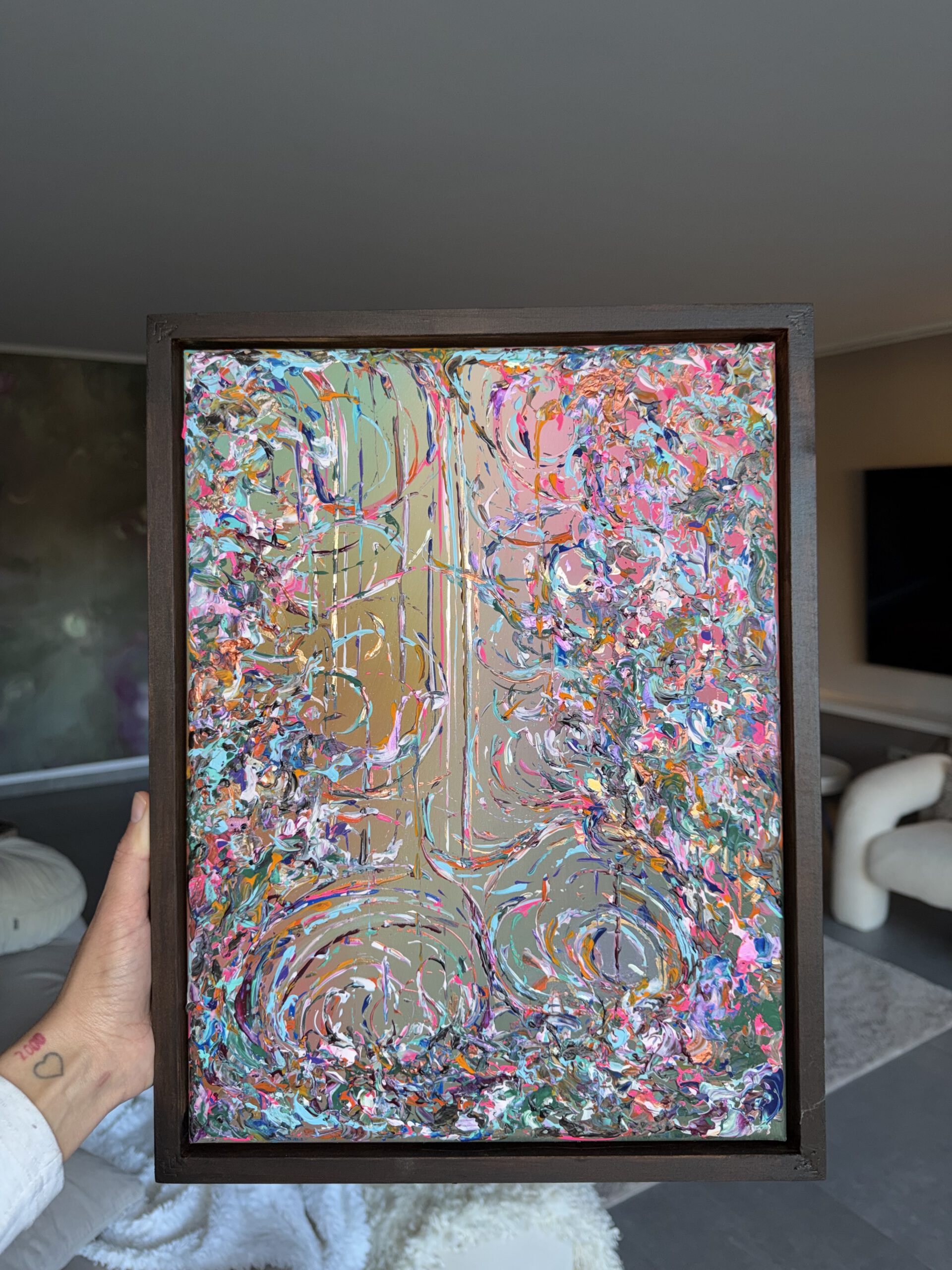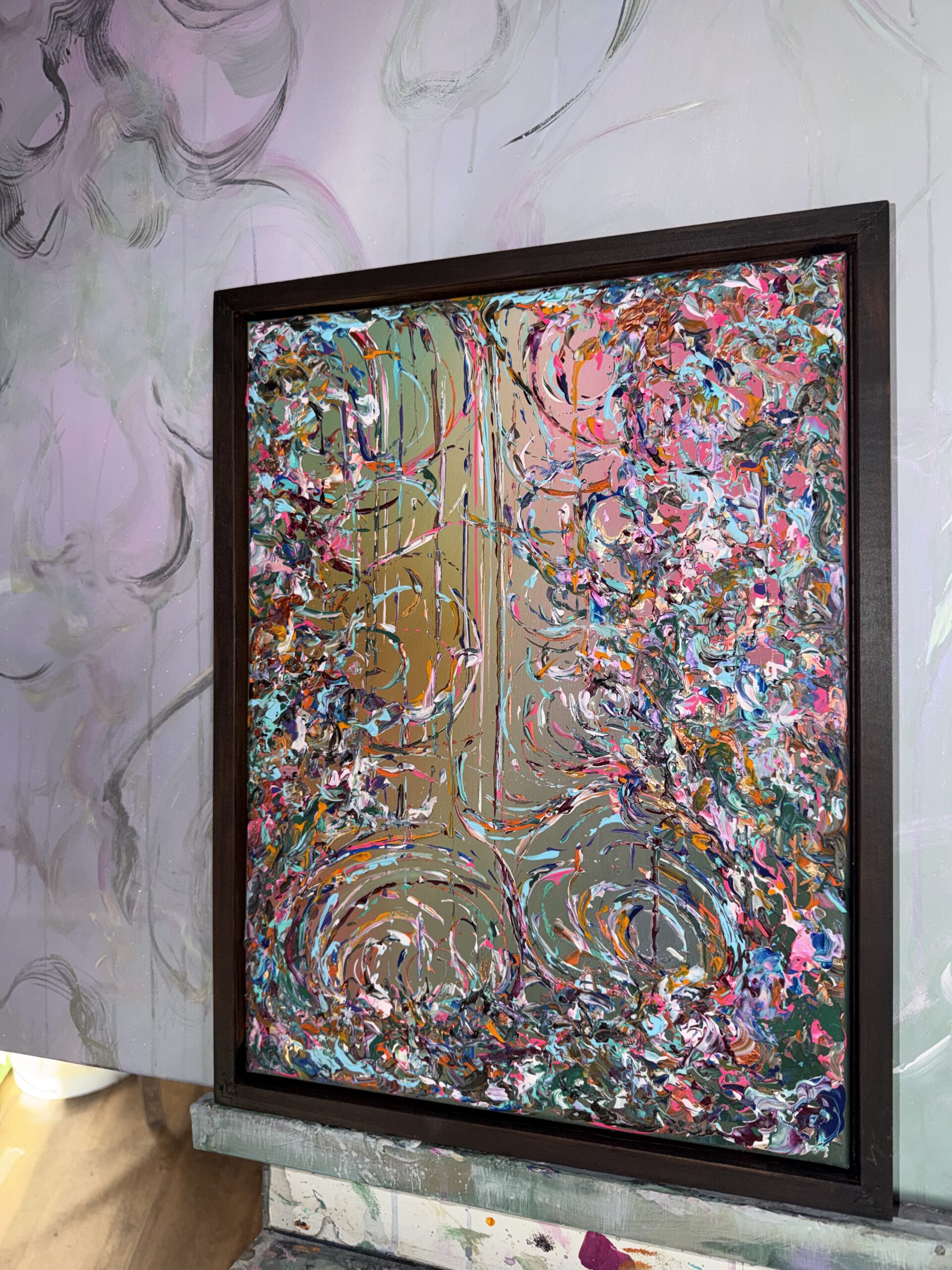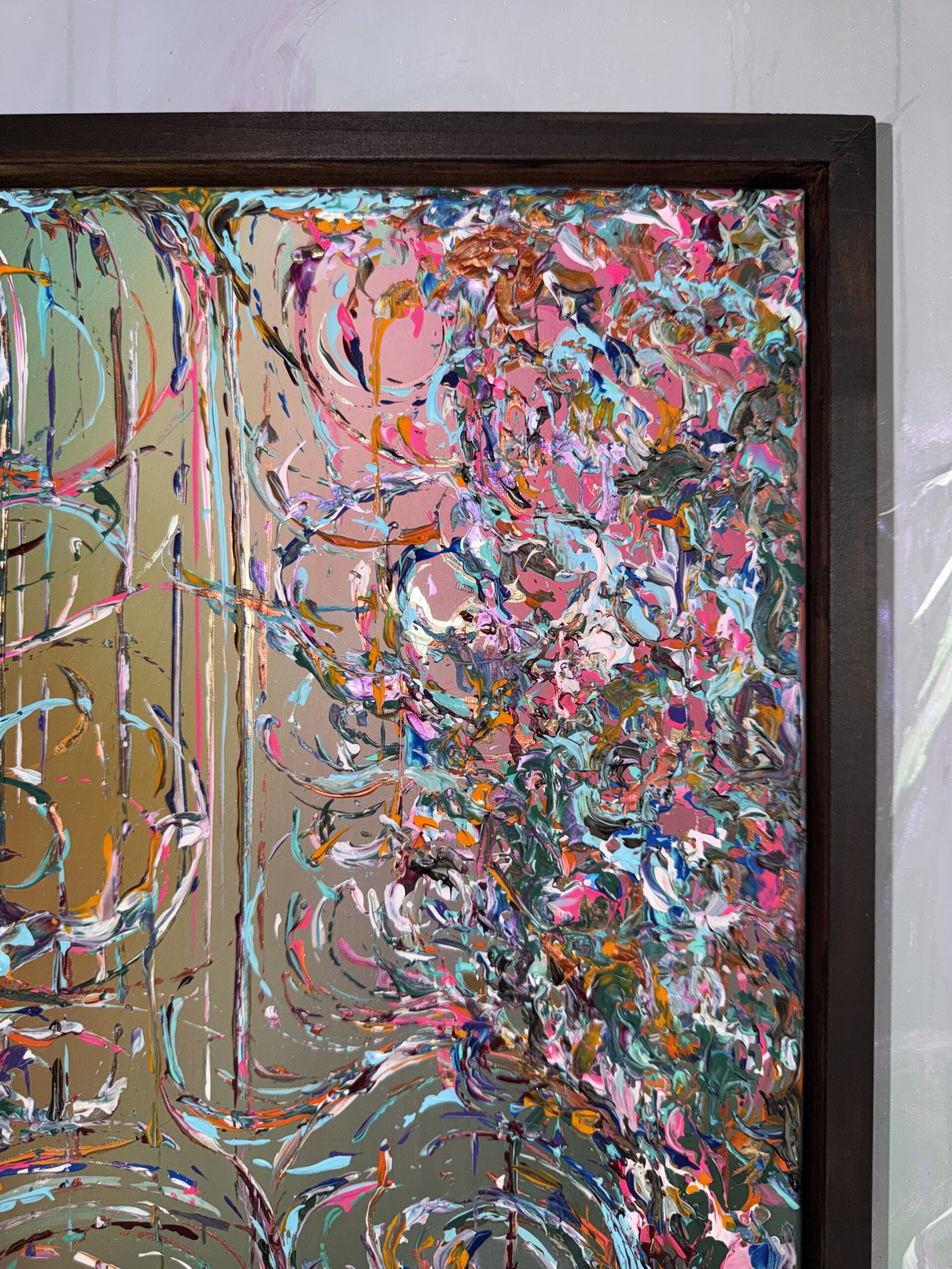In diesem Werk verschmelzen Barockbögen zu einer fließenden, harmonischen Komposition. Prägnante Farben wie Orange, Pink, Blau und Türkis treffen auf zarte, perlmuttartige Nuancen und werden von Akzenten in Goldlack veredelt. „Ibiza“ fängt die Leuchtkraft und Lebendigkeit der Inselfarben ein und verbindet opulente Formen mit einem modernen, spielerischen Ausdruck.